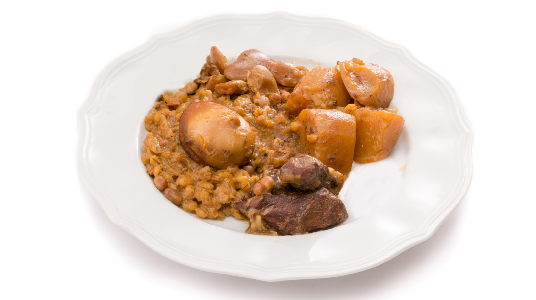 We decided to see what could be salvaged from ours. We extricated a few dry but flavorful potatoes, along with a crispy kugel that had safely sat atop the mass. Between the neighbor’s delicious kishke and beans and my crumbly potatoes, we enjoyed a complete cholent experience.