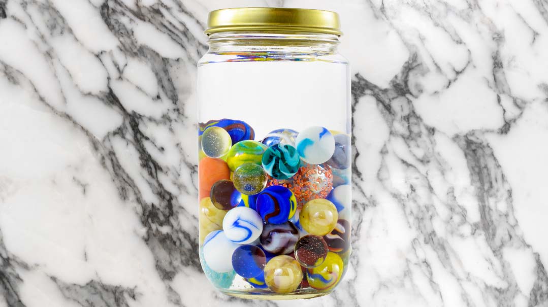 Today, she proudly displays her marbles next to her Shabbos candles — five jars brimming with 1,129 marbles to date.