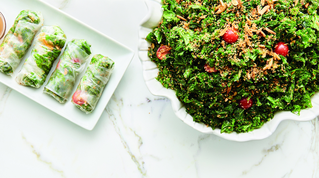 - Wash and dry kale. Remove and discard tough stalks and ribs. Tear leaves into bite-size pieces to make about 8 cups. Place kale into a large bowl; massage with your fingertips until leaves have wilted, about 5 minutes.