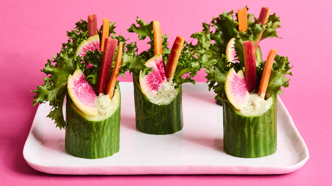 Place dip and vegetables into the cucumber cup.