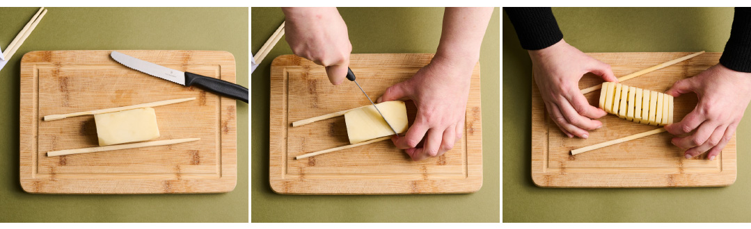 Position two chopsticks underneath a potato, one on each side. Cut the potato hasselback style, slicing it thinly but making sure you don’t cut all the way through to the bottom. Flip the potato over and cut diagonal lines.