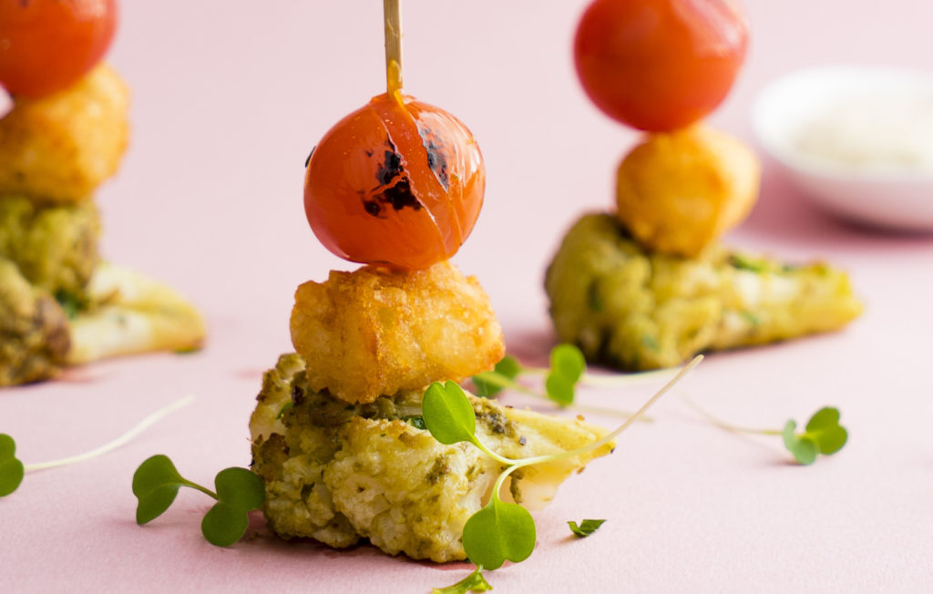 To be honest, I wasn’t sure how well this combination would go together, but it took me by surprise. The nuttiness of the pesto really enhanced the roasted cauliflower, and both flavors blended perfectly with the potato puff. Add the juicy tomato and some lemon-garlicky deliciousness, and you have a winner!