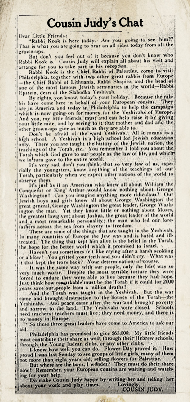 So these three great leaders have come to America to ask for our aid. Philadelphia has promised to give $65,000. My little friends must contribute their share as well, through their Hebrew schools, the Young Judean clubs, or any other clubs. I know how well you can do. Flower Day proved it. How proud I was last Sunday to see groups of little girls, many of them not more than eight years old, selling flowers for Palestine. But where are the boys, I wonder? They must do their share now! Remember, your European cousins are waiting and watching for your help.