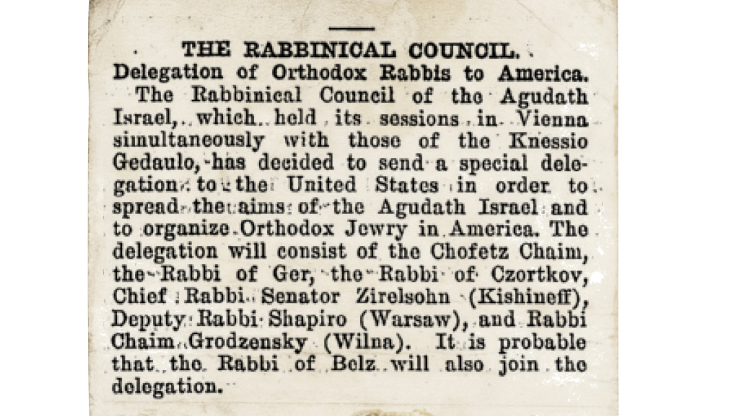 Perhaps the first major voyage that included renowned rabbis was the 1913 delegation of Rav Aharon Walkin and Rabbi Dr. Meir Hildesheimer, who were sent to America to raise awareness of the nascent Agudas Yisrael, recently founded in Katowice, Poland. The group followed up with a larger delegation in 1921, led by Rabbi Meir Dan Plotzki, Rabbi Dr. Meir Hildesheimer and Dr. Nathan Birnbaum.