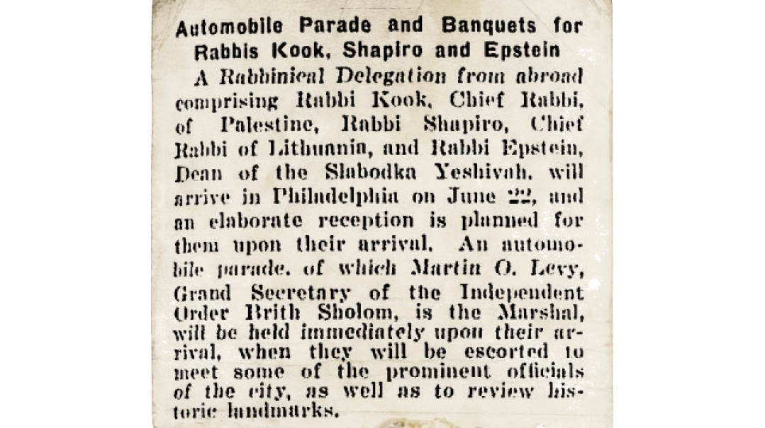 Rabbi Kook is the Chief Rabbi of Palestine, come to visit Philadelphia, together with two other great rabbis from Europe — the Chief Rabbi of Lithuania, Rabbi Shapiro; and the head of one of the most famous Jewish seminaries in the world — Rabbi Epstein, dean of the Slabodka Yeshivah.