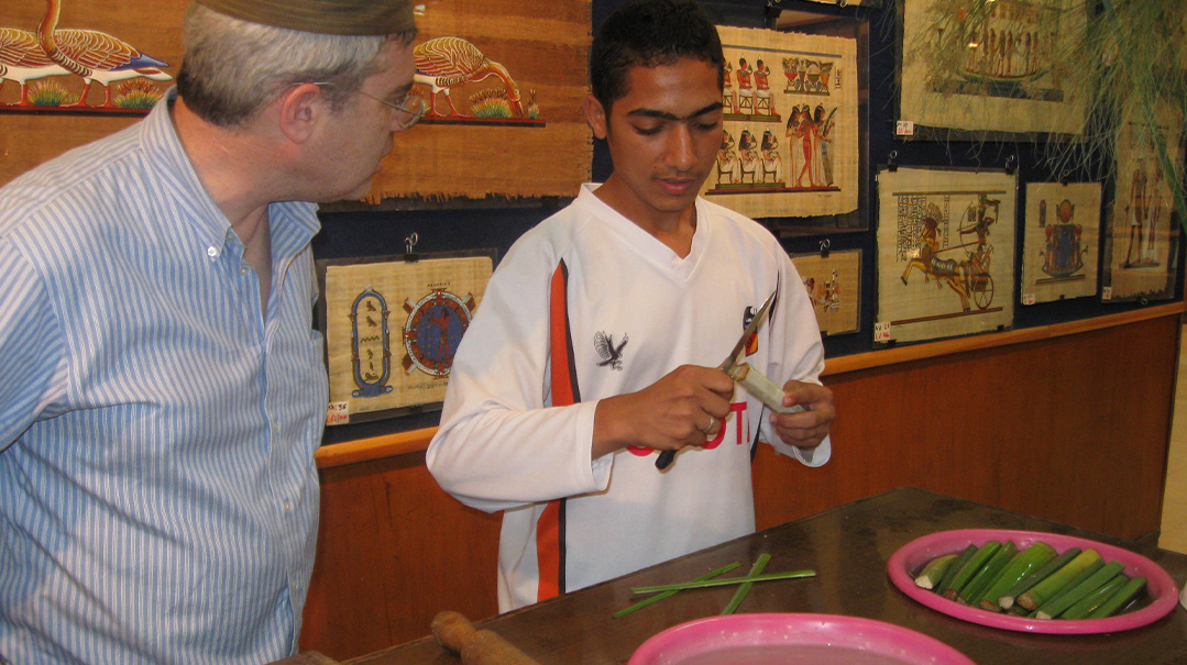 We know that papyrus isn’t only for paper. Owing to the highly buoyant stems, papyrus was often made into boats or rafts. When baby Moshe could no longer be hidden, his mother put him into a boat of gomeh. This is variously translated as bulrush or the closely related papyrus. These were enough reasons to visit a papyrus factory, albeit the tourist version, where we received training in how to soak, peel, and beat the reeds in order to produce the paper. Alas, boat-making was not included.