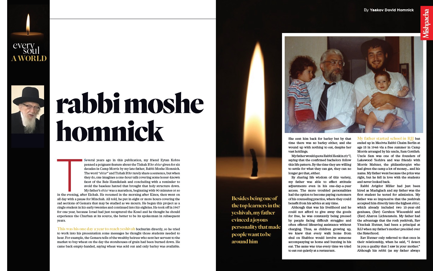 everal years ago in this publication, my friend Eytan Kobre penned a poignant feature about the Tishah B’Av shiur given for six decades in Camp Morris by my late father, Rabbi Moshe Homnick. The word “shiur” and Tishah B’Av rarely share a sentence, but when they do, one imagines a one-hour talk covering some lesser-known facet of the Beis Hamikdash and concluding with a reminder to avoid the baseless hatred that brought that holy structure down.
