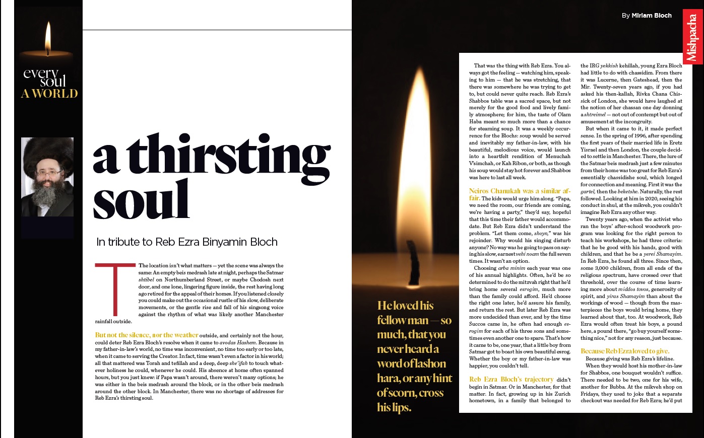 But not the silence, nor the weather outside, and certainly not the hour, could deter Reb Ezra Bloch’s resolve when it came to avodas Hashem. Because in my father-in-law’s world, no time was inconvenient, no time too early or too late, when it came to serving the Creator. In fact, time wasn’t even a factor in his world; all that mattered was Torah and tefillah and a deep, deep she’ifah to touch whatever holiness he could, whenever he could. His absence at home often spanned hours, but you just knew: if Papa wasn’t around, there weren’t many options; he was either in the beis medrash around the block, or in the other beis medrash around the other block. In Manchester, there was no shortage of addresses for Reb Ezra’s thirsting soul.