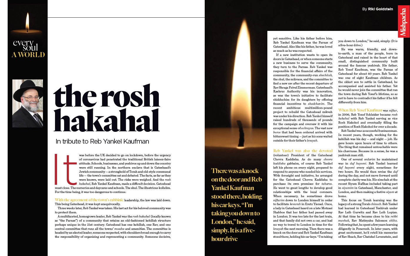 A multifaceted, homegrown leader, Reb Yankel was the rosh hakahal (locally known as “the Parnas”) of a community that retains an old-fashioned kehillah structure perhaps unique in the 21st century. Gateshead has one kehillah, one Rav, and one central committee that runs all the towns’ mosdos and amenities. The committee is headed by an elected leader, someone respected, with shoulders broad enough to carry the responsibility of organizing and representing a community. Someone decisive, yet sensitive. Like his father before him, Reb Yankel Kaufman was the Parnas of Gateshead. Also like his father, he was loved as much as he was respected.