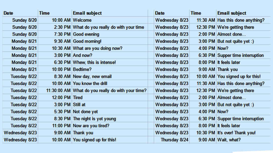 At the end of the week, I sent out one more email, asking my new friends what they thought of the experience. In a shocking departure from the four questions they were expecting, the email asked: