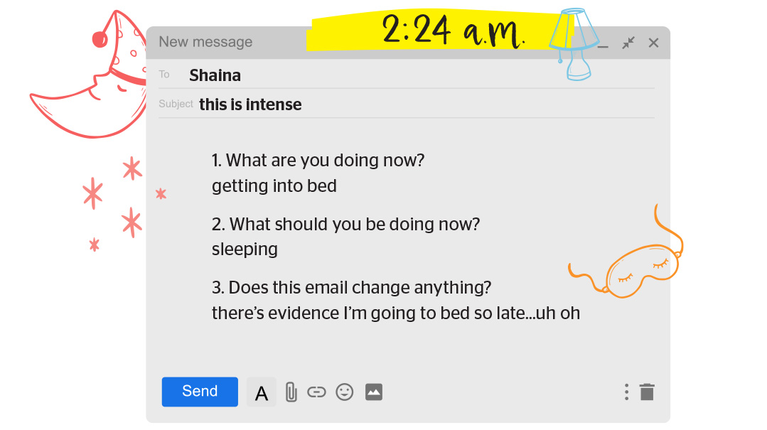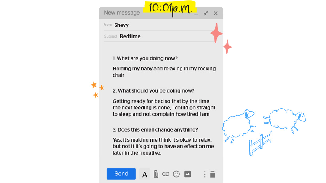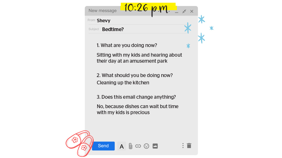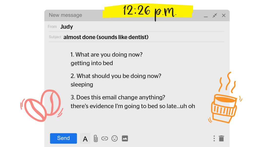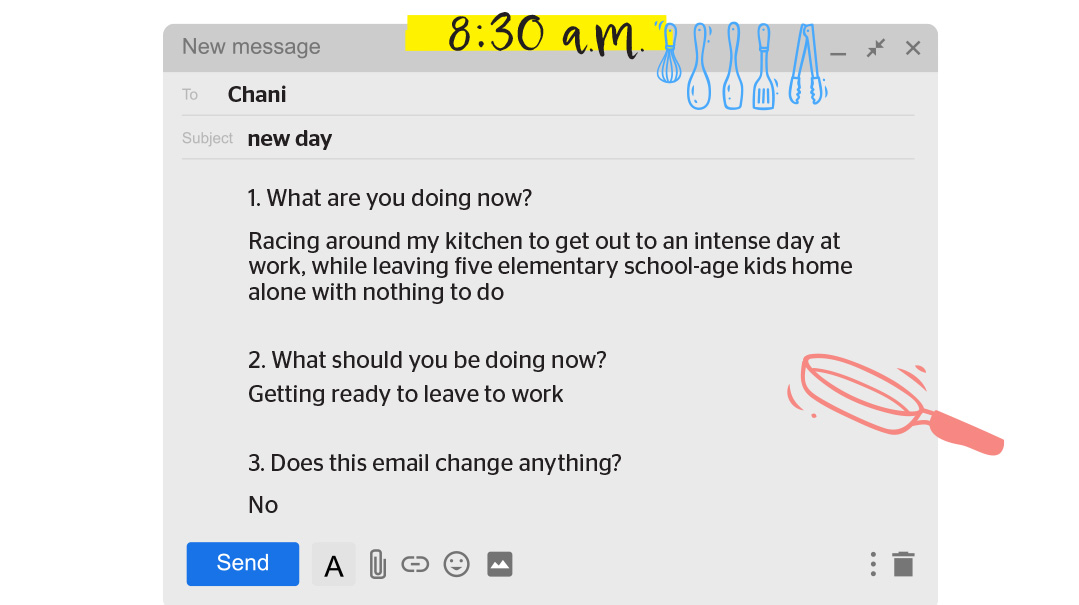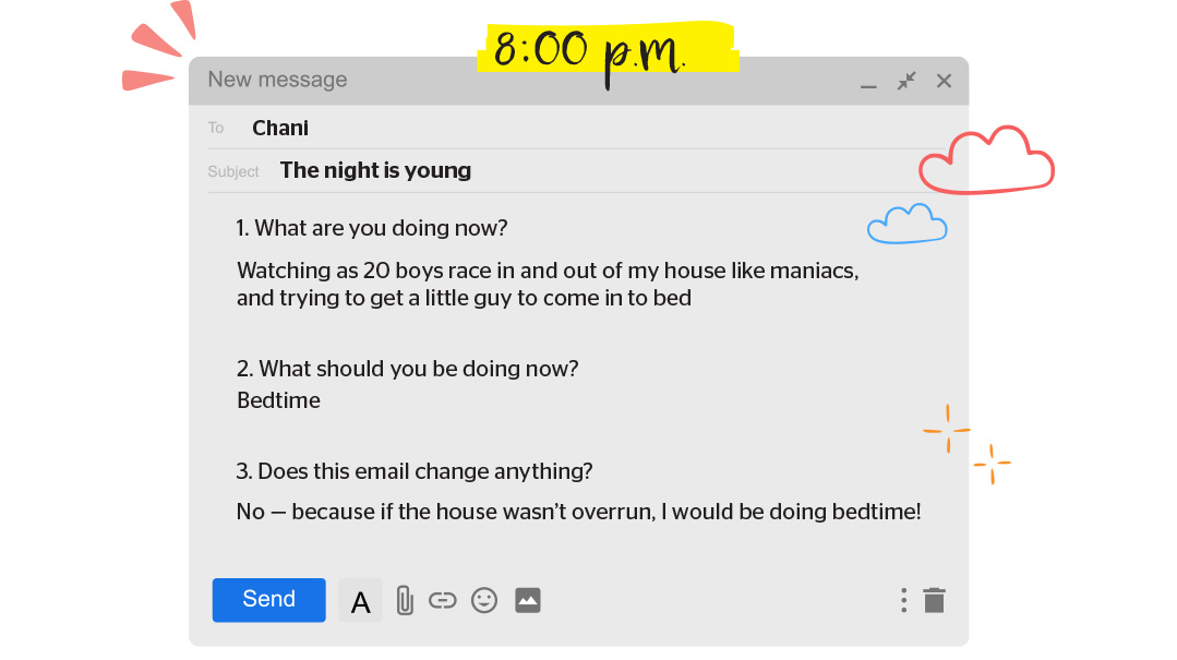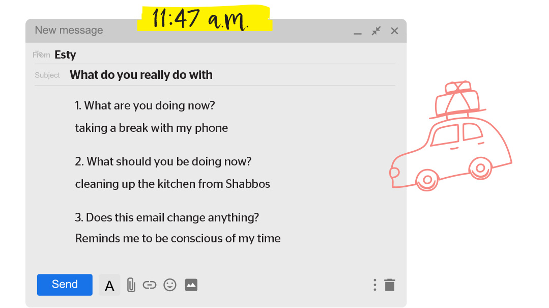 The main thing I got out of this was seeing how productive and happy we are as a control group. Most of the time we were doing exactly what we should have been doing, and no matter when I scheduled the emails to go out, the biggest change we got was “taking one less spoon of ice cream,” or “this email reminded me that I should eat.” As one of our participants wrote, “This made me realize maybe I’m not as bad at time management as I thought I was. I just have a crazy life.” Don’t we all, baruch Hashem.
