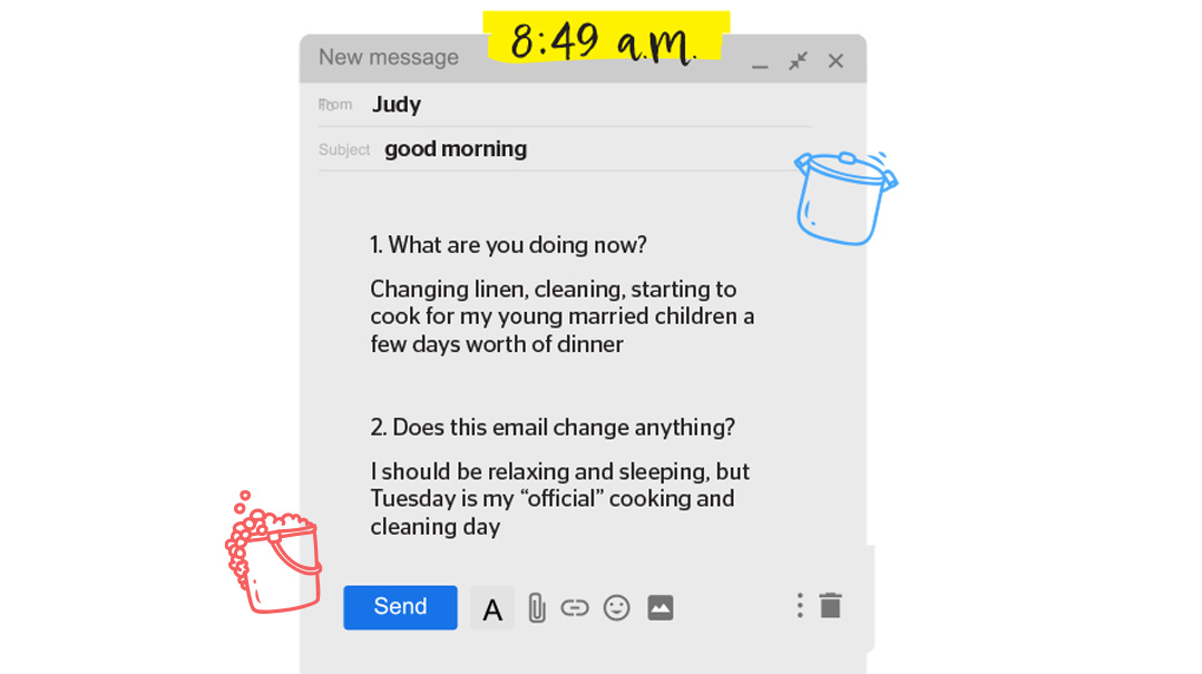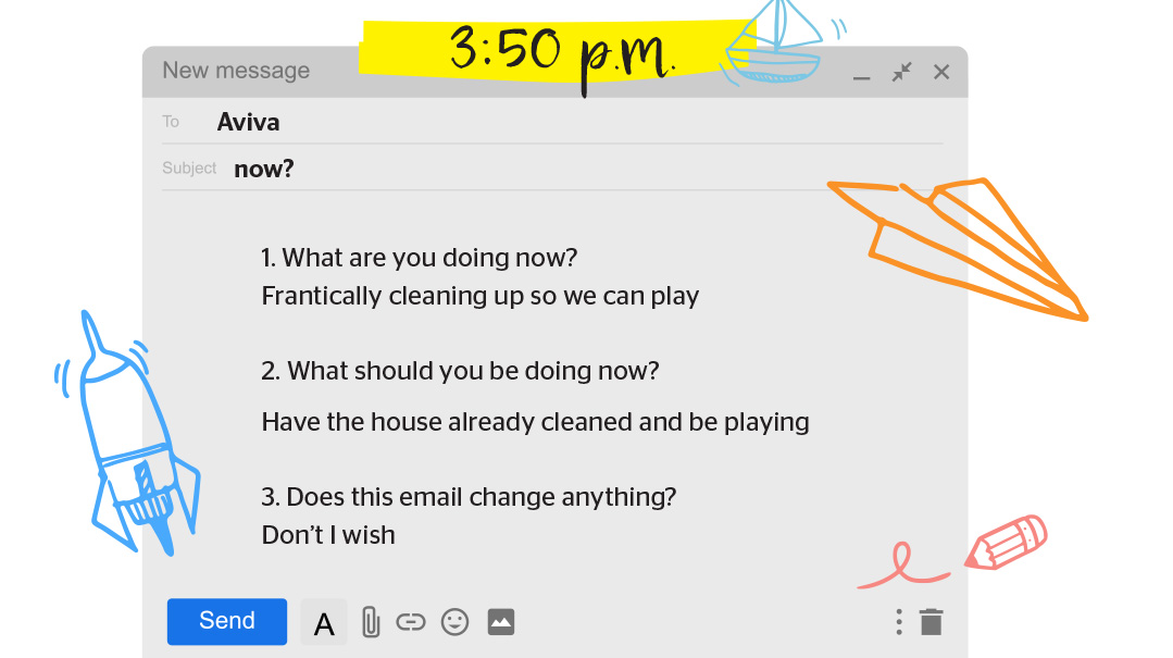 I put together a group of seven women between the ages of 20 and 65 — and in Israel. And I set out to find out: What do we really do with our time? This was a four-day intensive project, when I sent multiple emails a day to each participant. In each of these emails, I asked four questions: 1) What time did you receive this email? 2) What were you doing when you received it? 3) What did you want/were supposed/had set out to be doing at this time? 4) What, if anything, has receiving this email at this time done for you?