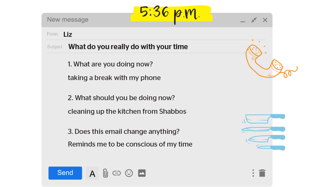 I’m married for three years, and I currently live in Lakewood. I work as a first-grade boys’ teacher, but I’m currently on maternity leave with my second baby. In general, I’m a very scheduled person; I like to know what has to be done for the day and I love having lists. I was very excited to join this experiment because I was curious to see whether I really don’t have time for all the things I say take so long to do.