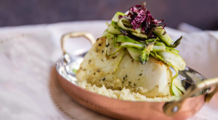 Roasted Sea Bass With Asparagus Ribbons 2 Tbsp Dijon mustard 4 Tbsp olive oil, divided zest of 1 lemon juice of ½ lemon 2 cloves garlic, minced 3 cubes frozen basil salt and pepper, to taste 5 Chilean sea bass fillets (about 6 oz/170 g each), skin removed 1 bunch thick asparagus Preheat oven to 425°F (220°C). … Continue reading Roasted Sea Bass With Asparagus Ribbons