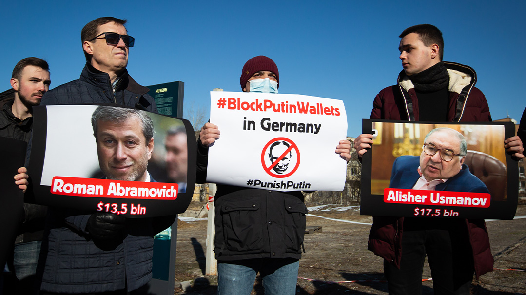 Activists hold portraits of oligarchs Alisher Usmanov and Roman Abramovich during a rally demanding sanctions against them