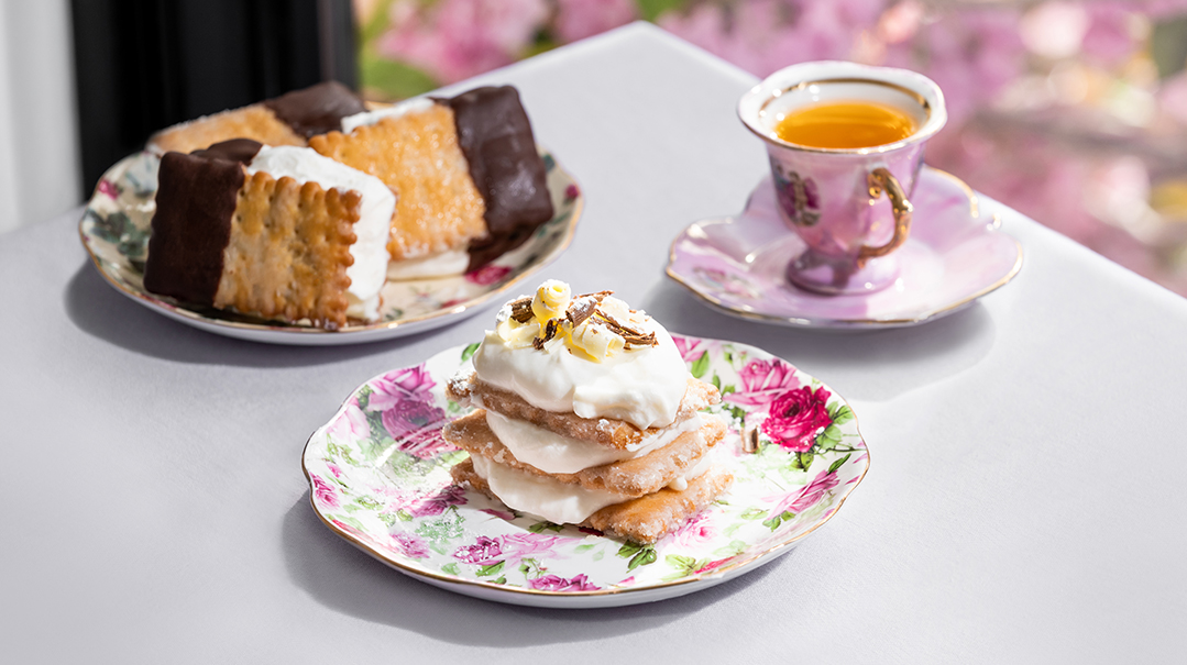 You can really elevate this presentation by serving the cheesecake in individual portions. Place 1 caramelized tea biscuit on each plate. Add a dollop of the cream cheese mixture and then another biscuit. Repeat until you have 3 layers of biscuits and 3 layers of cream, ending with the cream. Give the tops a generous dusting of confectioners’ sugar and add a few shavings of milk chocolate. Serve and enjoy!