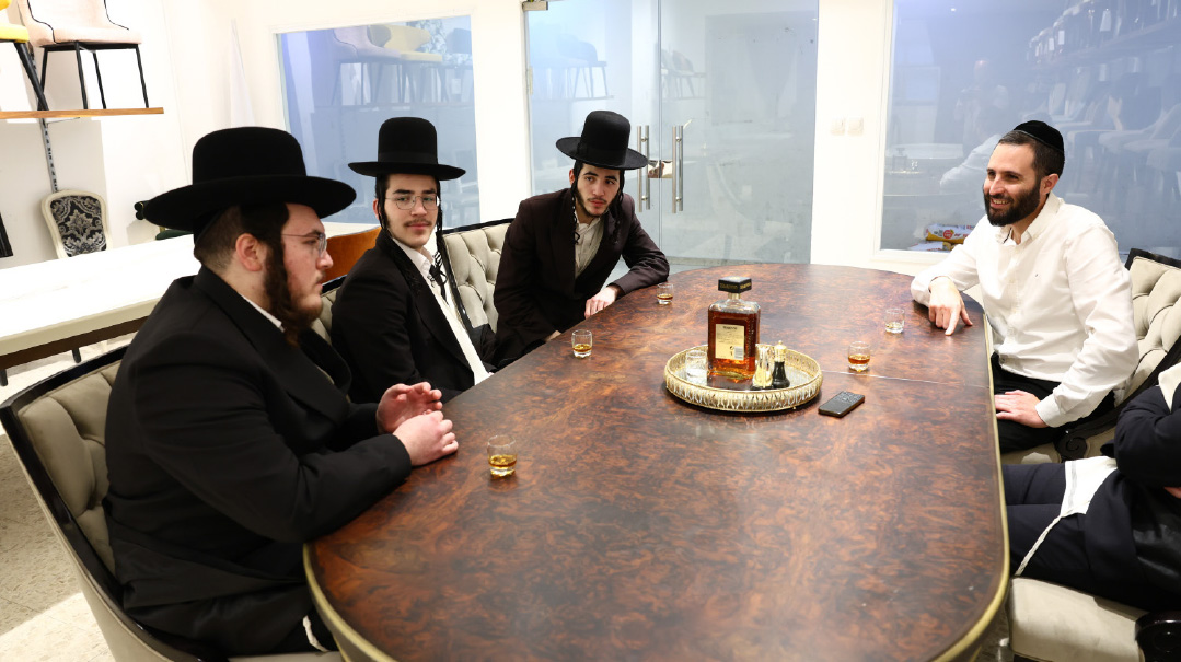 Nachman Leizerovits, who received free advertising he never wished for, shares a l’chayim with Mendy (left), Yoeli and Yehuda Fisch
