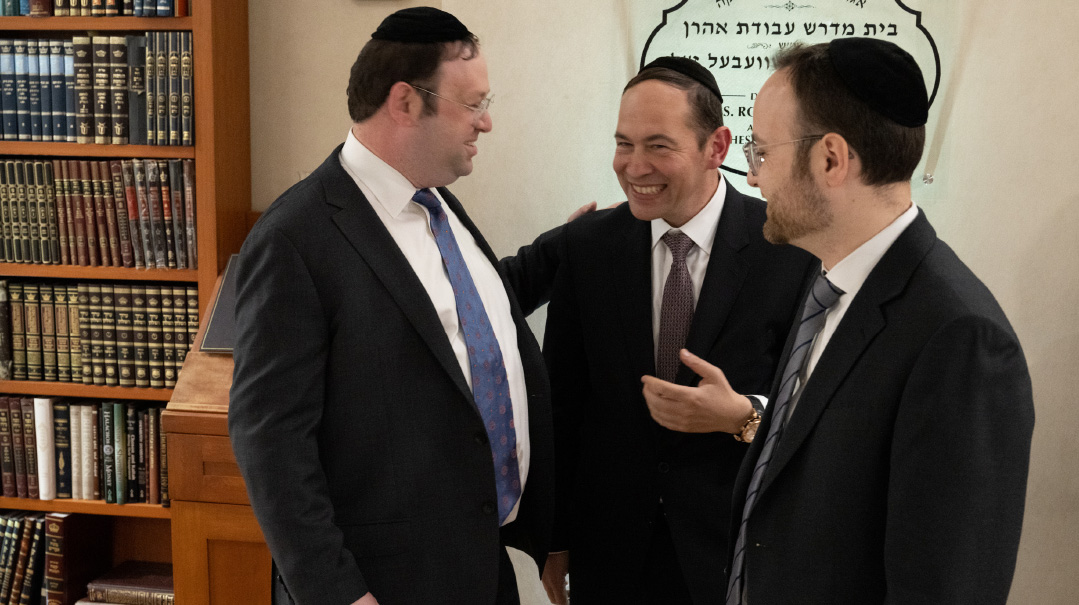 Agudah leadership activists Shai Markowitz (right) and Nechemiah Hoch (left) in a briefing with an always cheerful Rabbi Miller: “It’s almost impossible to find him in a negative mindset.”
