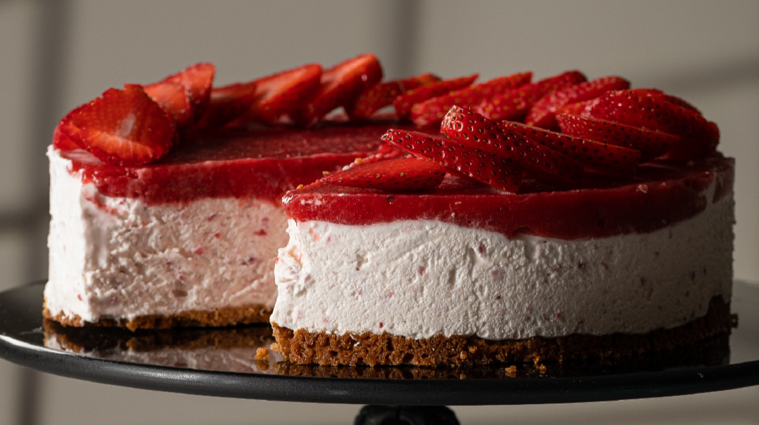 To serve, remove from freezer several minutes before plating to soften slightly. Garnish with fresh strawberries and mint, and additional whipped cream, if desired.