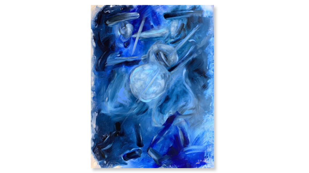 Dark-blue waltzes around the middle, surrounded by cobalt and cornered by Prussian blue. It’s thick; I add some water to the brush while continuing to sway the brush back and forth, and it hits the consistency I’ve envisioned. Therapy is getting all that color off the brush and onto the canvas.