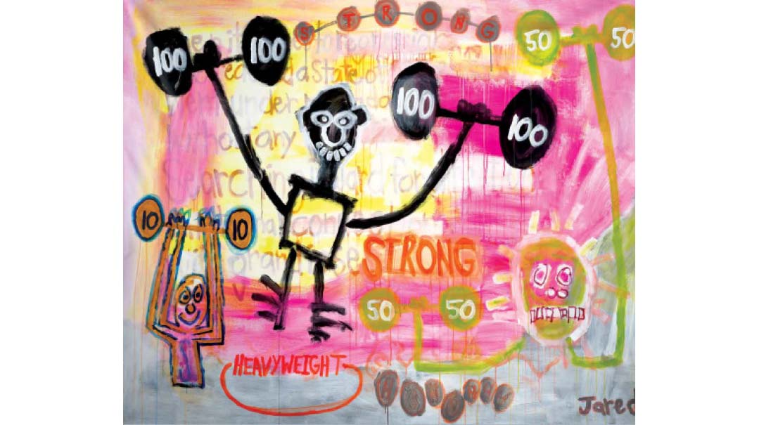“I’m projecting out from a very deep place, a chicken. It’s scared, but once it comes out, it’s less scared,” Jared explains. “Next to the chicken is the warrior — I transform my fears and vulnerability to strength, like a warrior. The arrows represent the weapons used to break down the facade of someone, and the facade is what gets in the way of us getting real, of taking changes and taking risks. On the right are five sticks, like fingers, holding onto a ball of infinity, because once we’ve waged war on our fears, we really can stretch to infinity.”