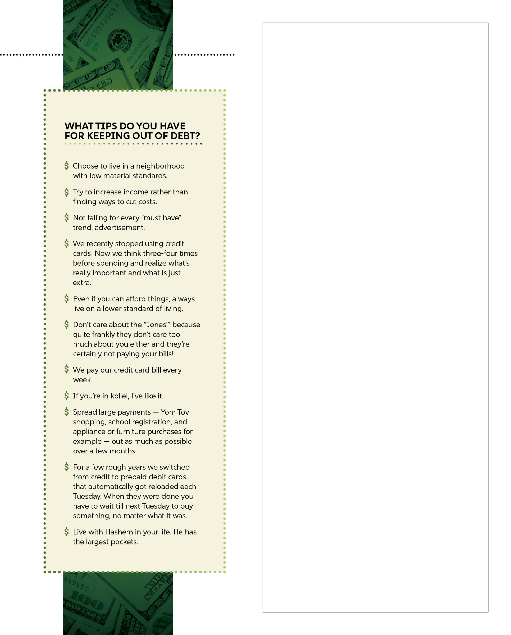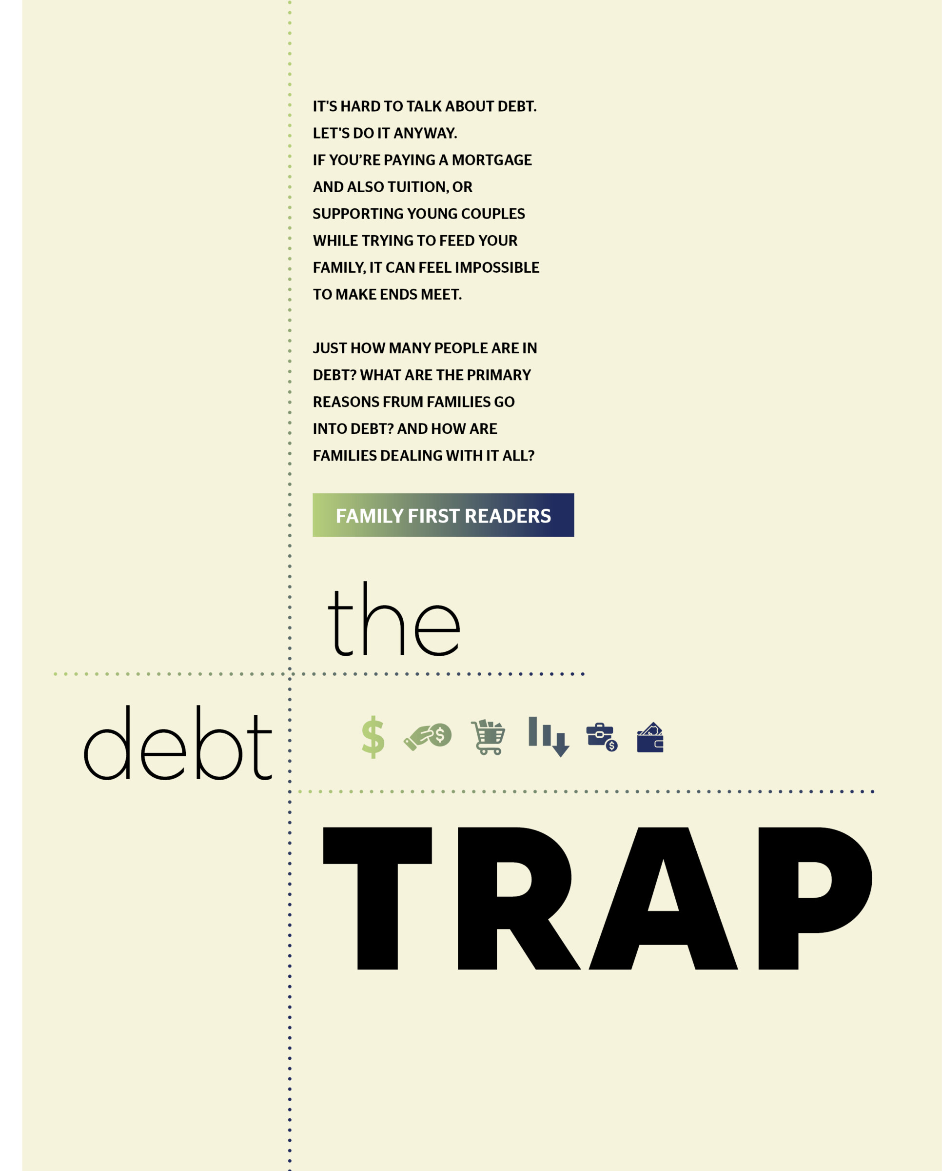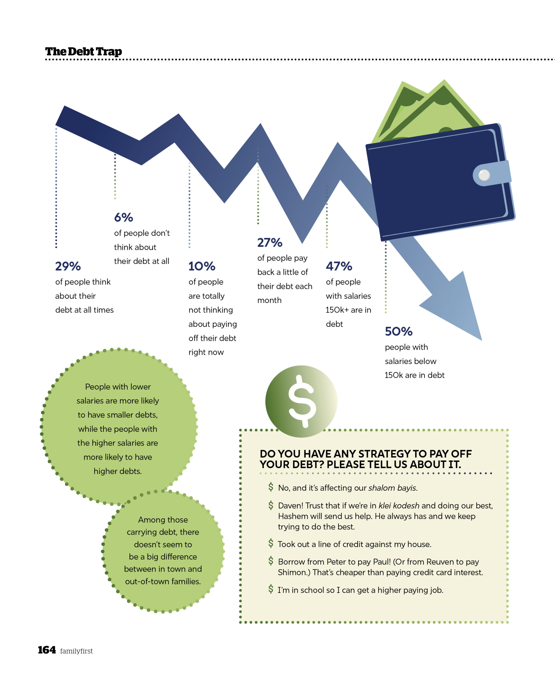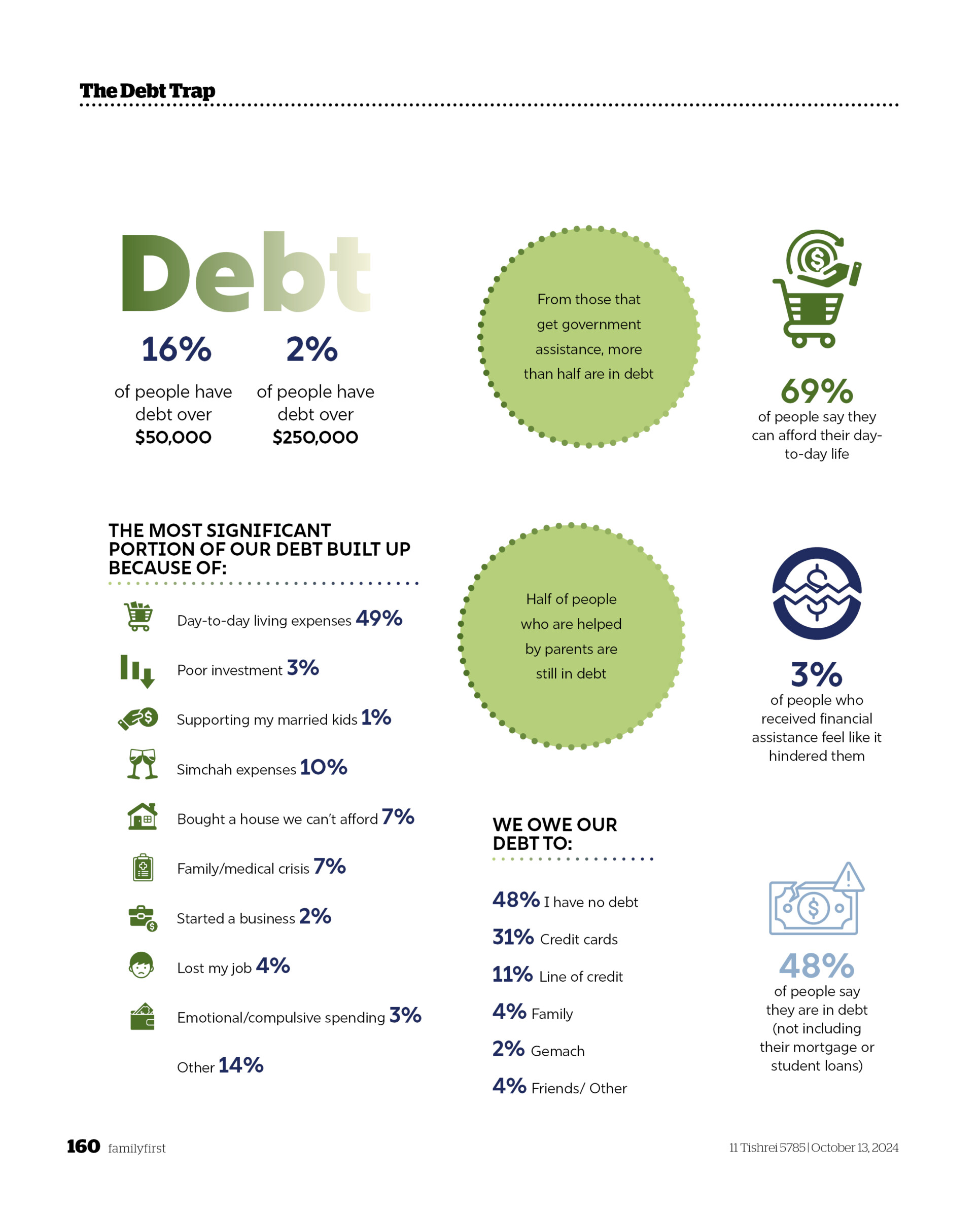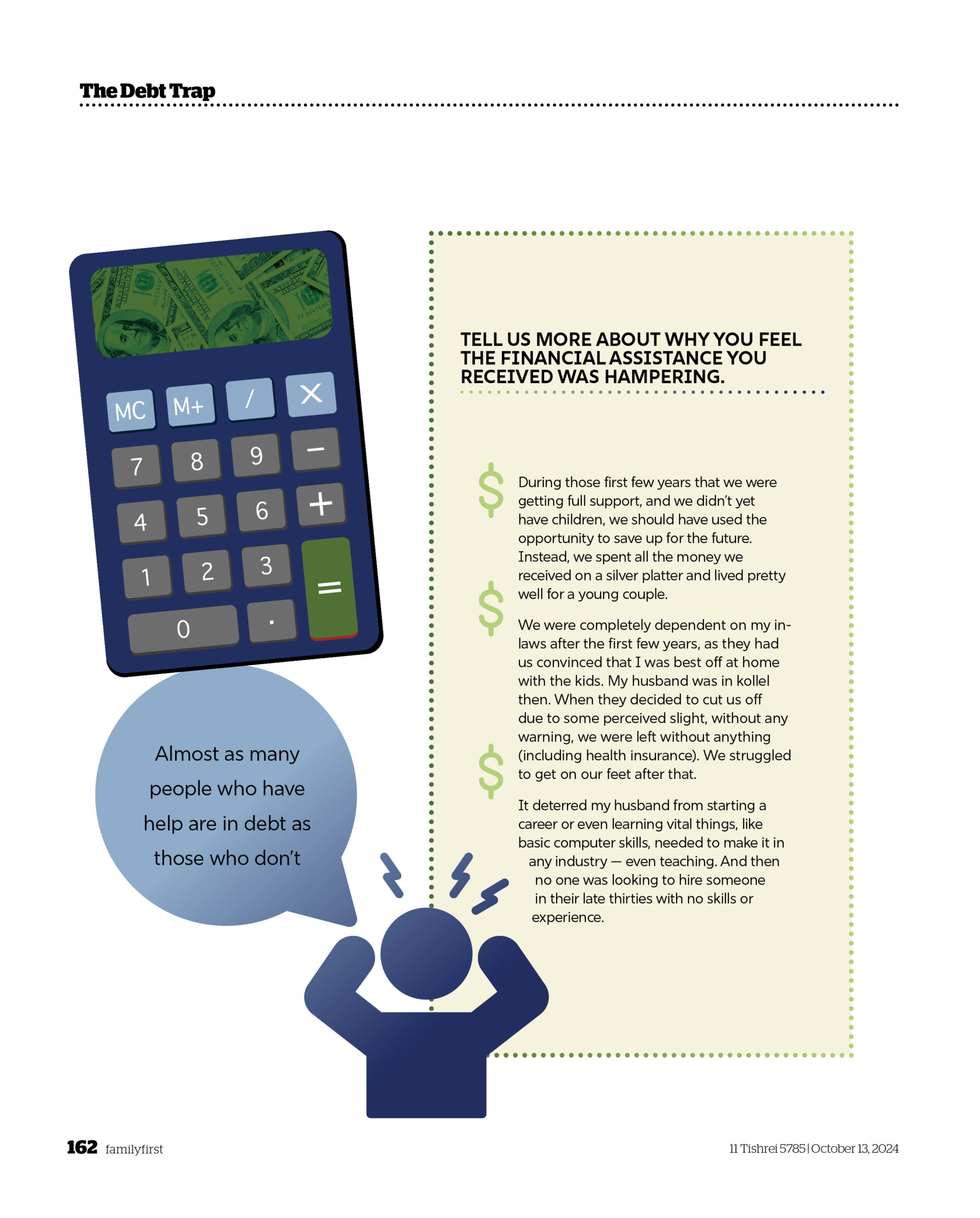 | Family First Feature | The Debt Trap By Family First Readers | October 13, 2024 Is our community in debt? Stats, stories, and solutions (Originally featured in Family First, Issue 915) [gravityform id="13" title="false" description="false" ajax="true"] RELATED CONTENT Barbara BensoussanThe Para Dilemma What happens when classroom support for struggling students creates new problems? Esther Shaindy LeshkowitzJunk Drawer Confidential What your junk drawer says about you Shoshana GrossTo Make a World Four women use junk to create a magical experience for a frum audience Family First ContributorsThe Hills We’ll Die OnA collection of very strong opinions about very small things Bashie LiskerHolding Down the Fort When a husband travels regularly for work, what’s it like for the family? Leah WeishautJudgment Calls My father was a lawyer by trade — but a rabbi at heart + See all >