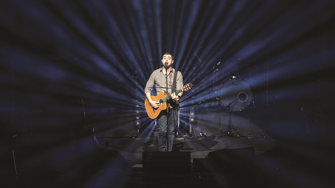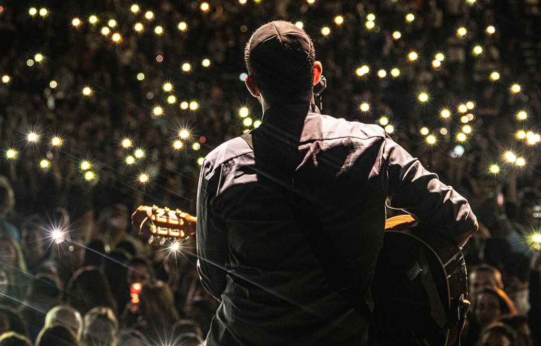he distance from the Binyanei Ha’umah dressing room to the stage is all but 200 feet, but the passage feels like a wormhole between two worlds. On the one side, there’s the rickety table and the floor that hasn’t been replaced since Binyanei Ha’umah was completed in 1963. On the other, there are bright, flashing lights and billowing smoke, adoring fans who rise to their feet to cheer, and huge video screens projecting the band like giants. So it’s a bit hard to reconcile Ribo, who is so casual and cool, so down to earth, with his other persona — music star.