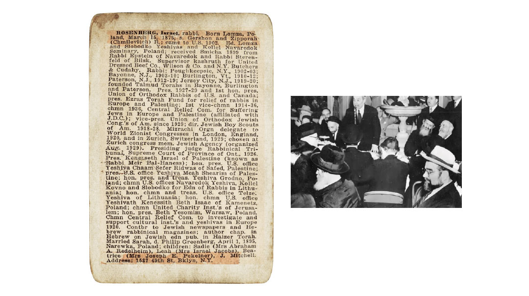 His rabbinical career spanned more than 50 years and several cities in the Tristate area, as well as a stint in Burlington, Vermont. Yet for the unassuming musmach of Lomza, Slabodka, Maltsh, and Novardok (where he was ordained by the Aruch Hashulchan), it was with the Agudath Harabonim where Rabbi Rosenberg would make his primary impact. An outstanding orator and passionate defender of Yiddishkeit, he stood steadfast against dissenters and worked to raise the prestige of the Orthodox rabbinate at a time when the steady stimulus of new ideas threatened traditional Jewish life.