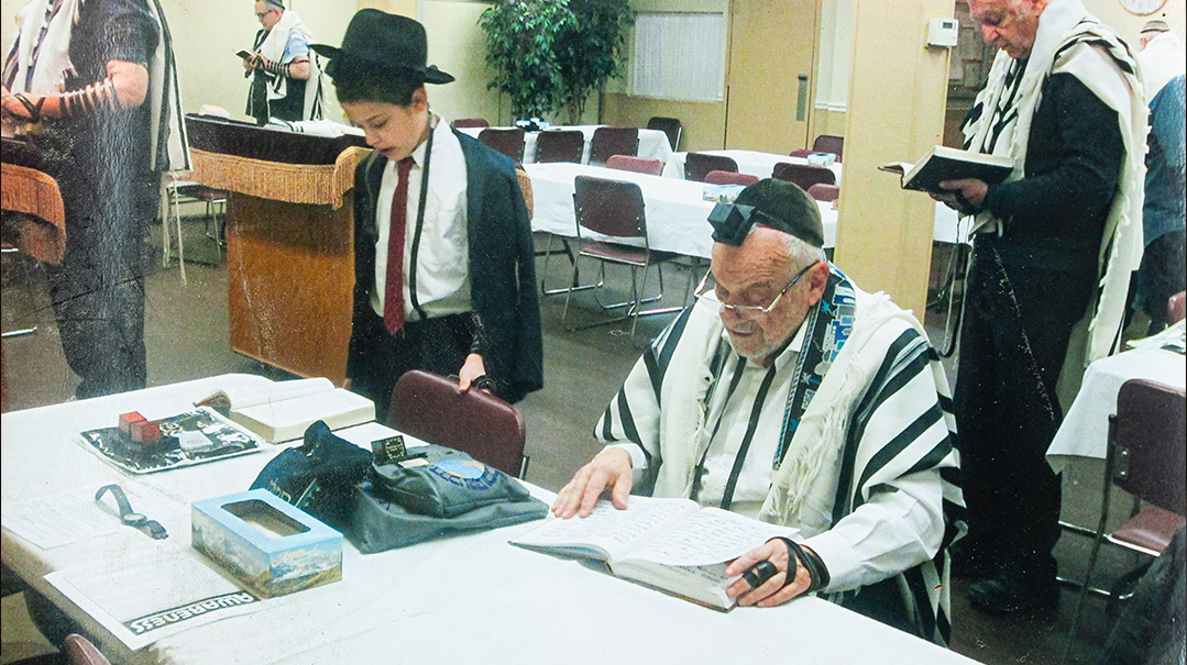 Rabbi Wein with a grandson laying tefillin for the first time. “Historically, communities only flourish when there’s a strong core of Torah”