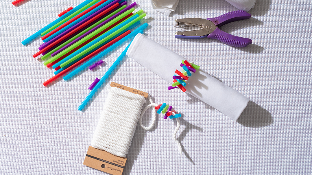 - Thread as many straws as you’d like onto the string, then tie the ends to fit your rolled napkins.