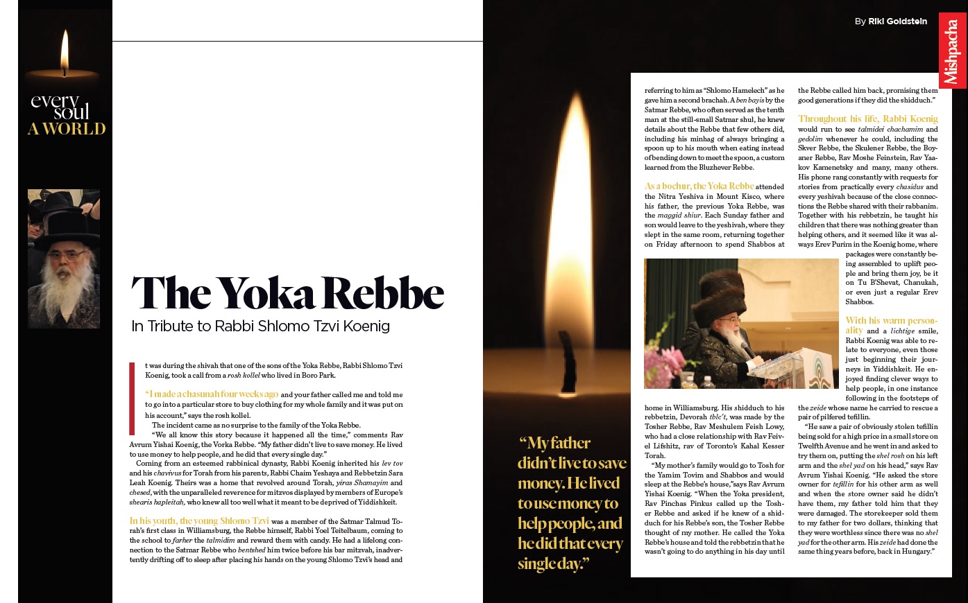 The Yoka Rebbe was niftar just four days before his 72nd birthday, nearly four years to the day after his father’s passing. He was laid to rest in Floral Park, New Jersey, leaving thousands of followers devastated by their inability to accompany him on his final journey. He is survived by his rebbetzin, Devorah, his sons and his sons-in-law Rav Chaim Meyer Streicher, rosh hakahal of the Yoka Shul; Rav Yisroel Meyer Koenig, rosh beis din Orach Mishor; Rav Yehuda Leib Koenig, rosh kollel Ziv Hatorah; Rav Chaim Meir Pollack; Rav Yoel Pearl; Rav Alter Chaim Meir Pollack; Rav Yakov Yoseph Koenig, rosh kollel Choshen Mishpat; Rav Dovid Moshe Koenig, maggid shiur Rachmistrivka yeshivah; Rav Yidda Eisen; Rav Aron Mordechai Koenig, rosh kollel Vien of Boro Park; and Rav Avrum Yishai Koenig, Vorka Rebbe, as well as his daughters, Mrs. Chaya Esther Streicher; Mrs. Faiga Rivka Pollack; Mrs. Bracha Malka Perl; Mrs. Sheva Blima Pollack; and Mrs. Miriam Yittel Eisen.