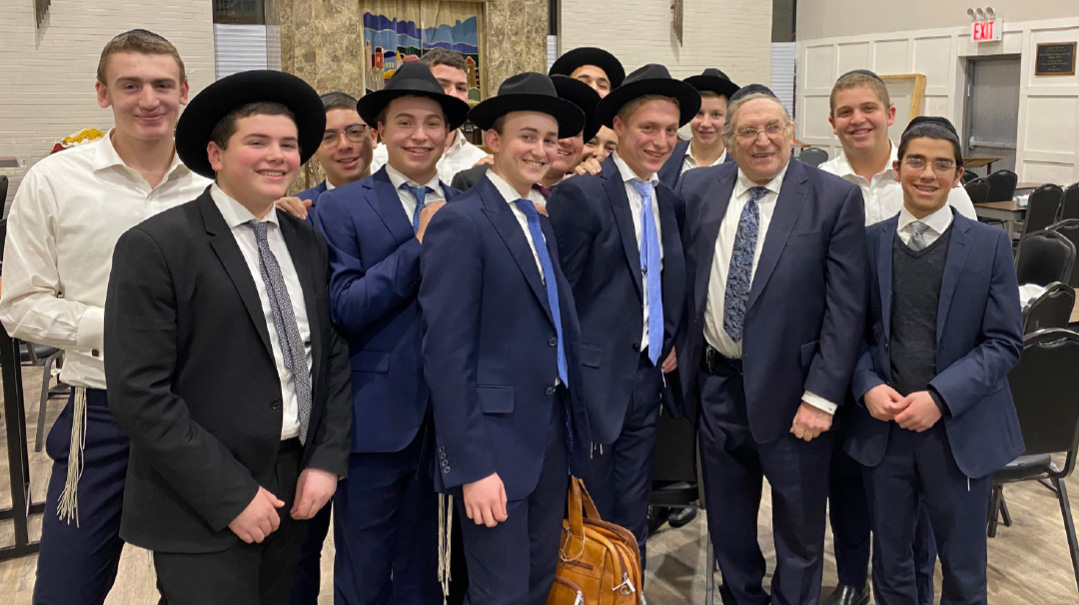 Regardless of age or stage, Rabbi Krohn’s heartfelt messages penetrate. “I would never speak about something that I myself couldn’t act upon,” he explains. Here he stands with a group of bochurim following a talk given in Far Rockaway’s Yeshivas Shaarei Chaim. To Rabbi Krohn’s right is his grandson, Binyomin Perlstein