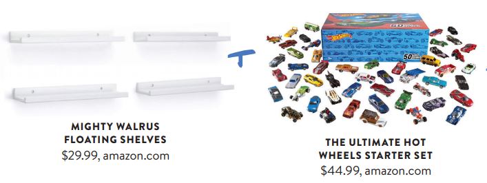 Whenever I walked into the playroom, the cars were out, so I finally said, “If you can’t beat ’em, join ’em!” Displaying them on these picture shelves meant that even though they aren’t neatly tucked away, they’re pretty to look at. Hang up the shelves with the easy hardware that’s included, or you can even get lazy and use Command strips. Place the cars on the shelves, and you have functional room decor! You can even arrange the cars according to color to work within your color scheme.