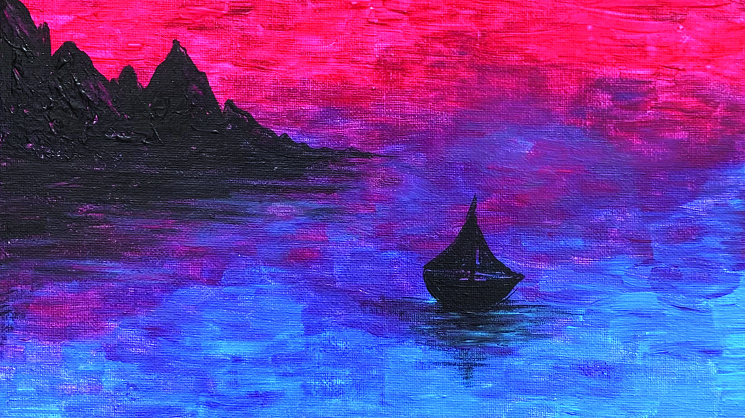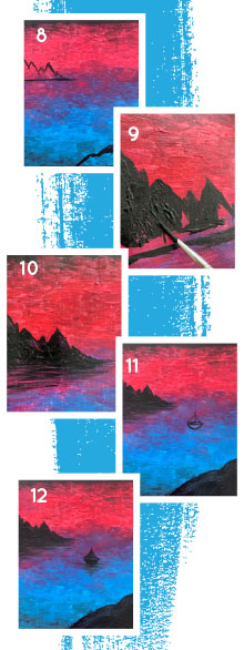 12 Fill in the boat with black. Add a small shadow underneath using the same small horizontal strokes you did for the mountains.