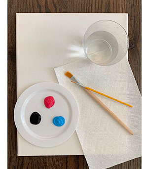 Put a bit of each color onto a plate to create your palette. Set out a cup of water and a paper towel next to your canvas in case you need to wash your brush at any point.