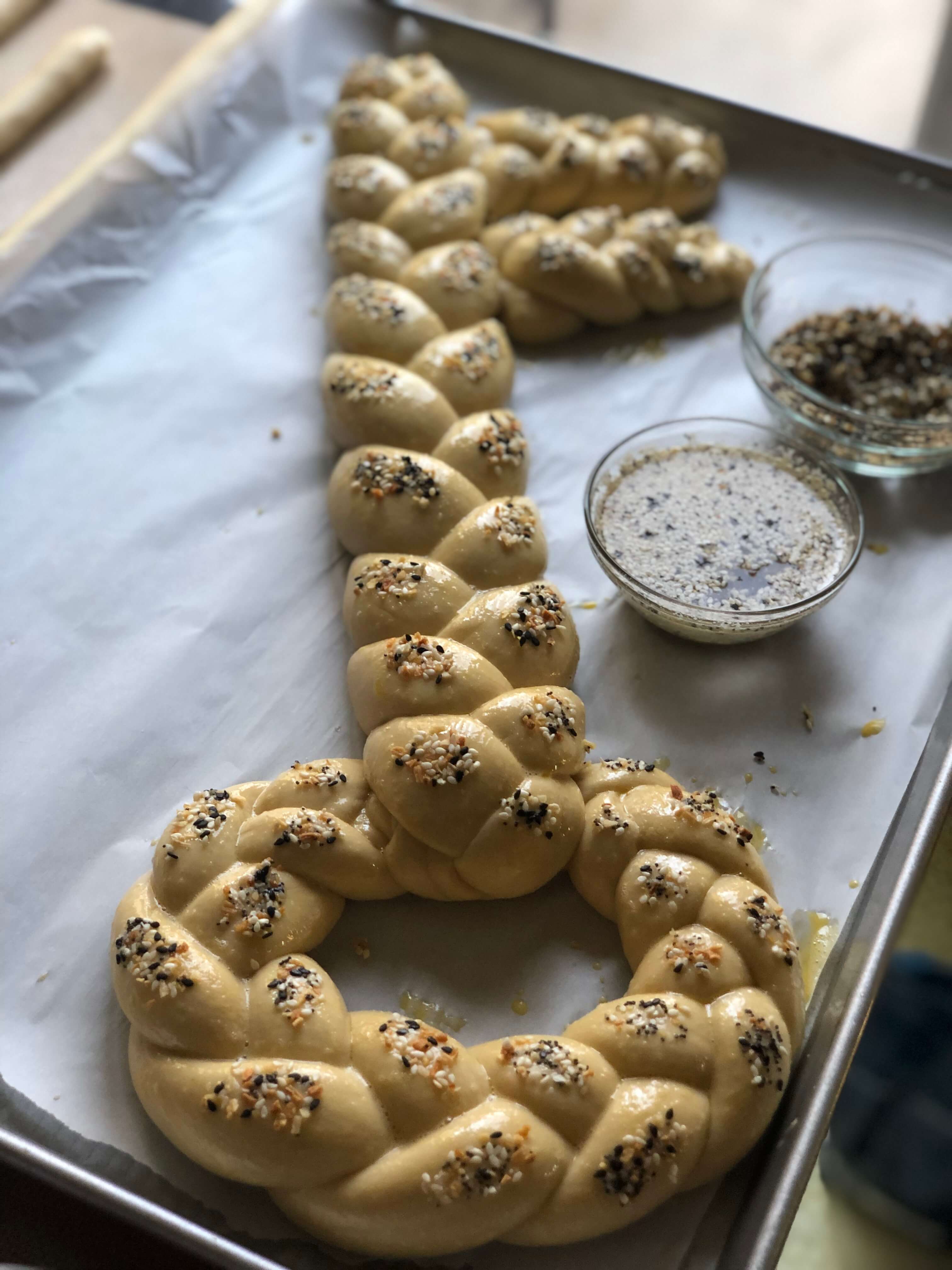 3. To make the seeds look neat, as pictured: Prepare a small bowl of water and a plate of seeds (I used Everything bagel spice). Right before you place the challah in the oven, dip your index or middle finger into the water, then into the seeds, and place
