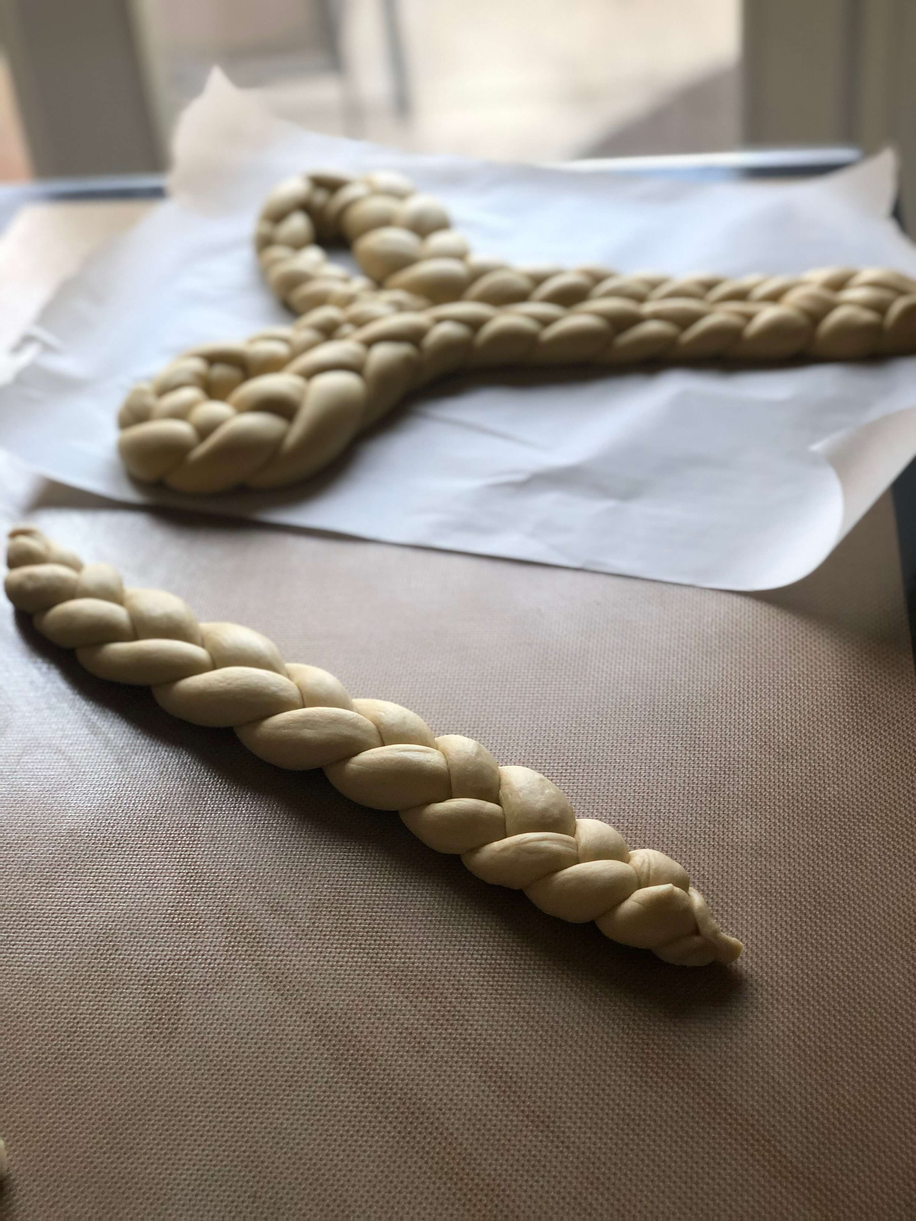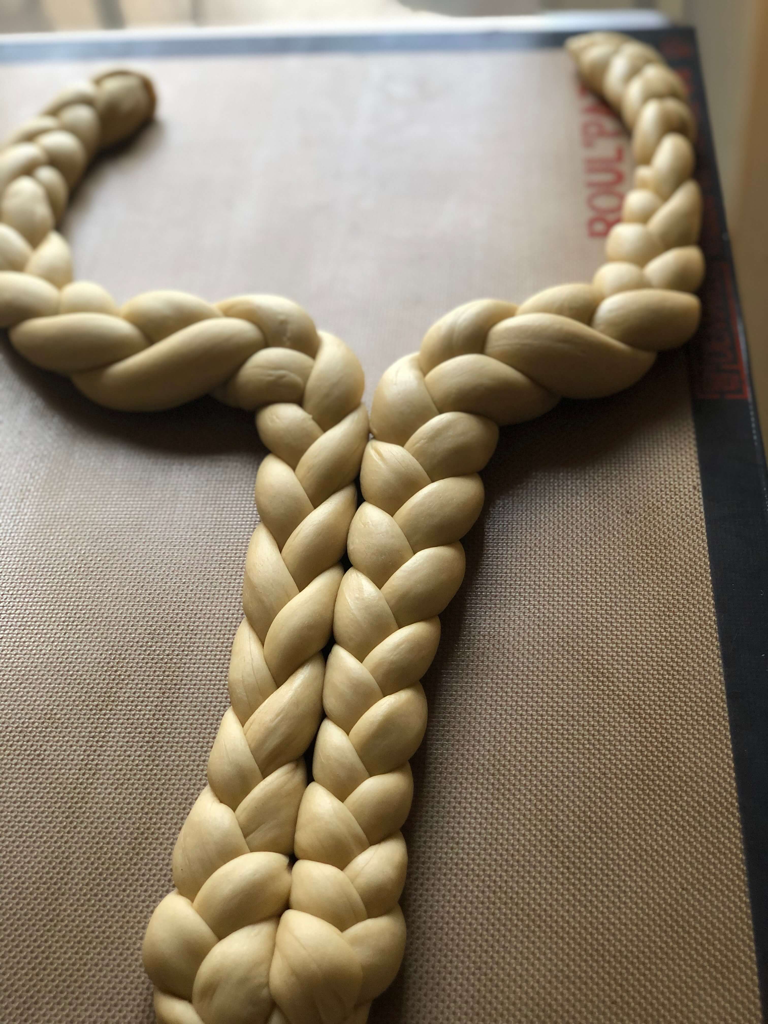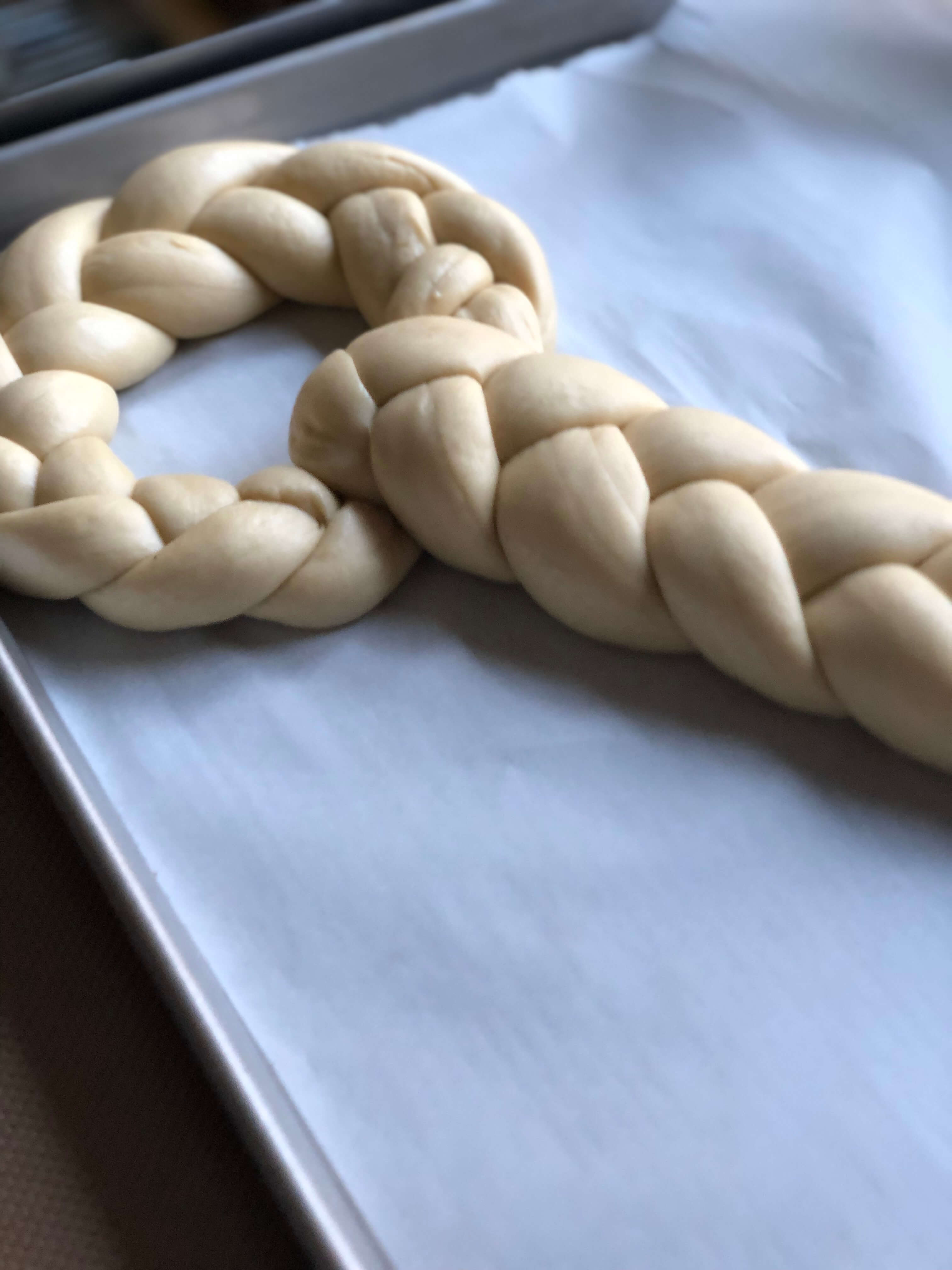 2. On an extra-large baking sheet lined with parchment paper, place the two larger braids side by side, with the lower halves of the braids touching, and upper halves curved outwards, to form a u-shape. Bring down the “arms” of the u toward the center to resemble a heart shape. Shape the middle-sized braid into an oval and place in the center of the "heart."