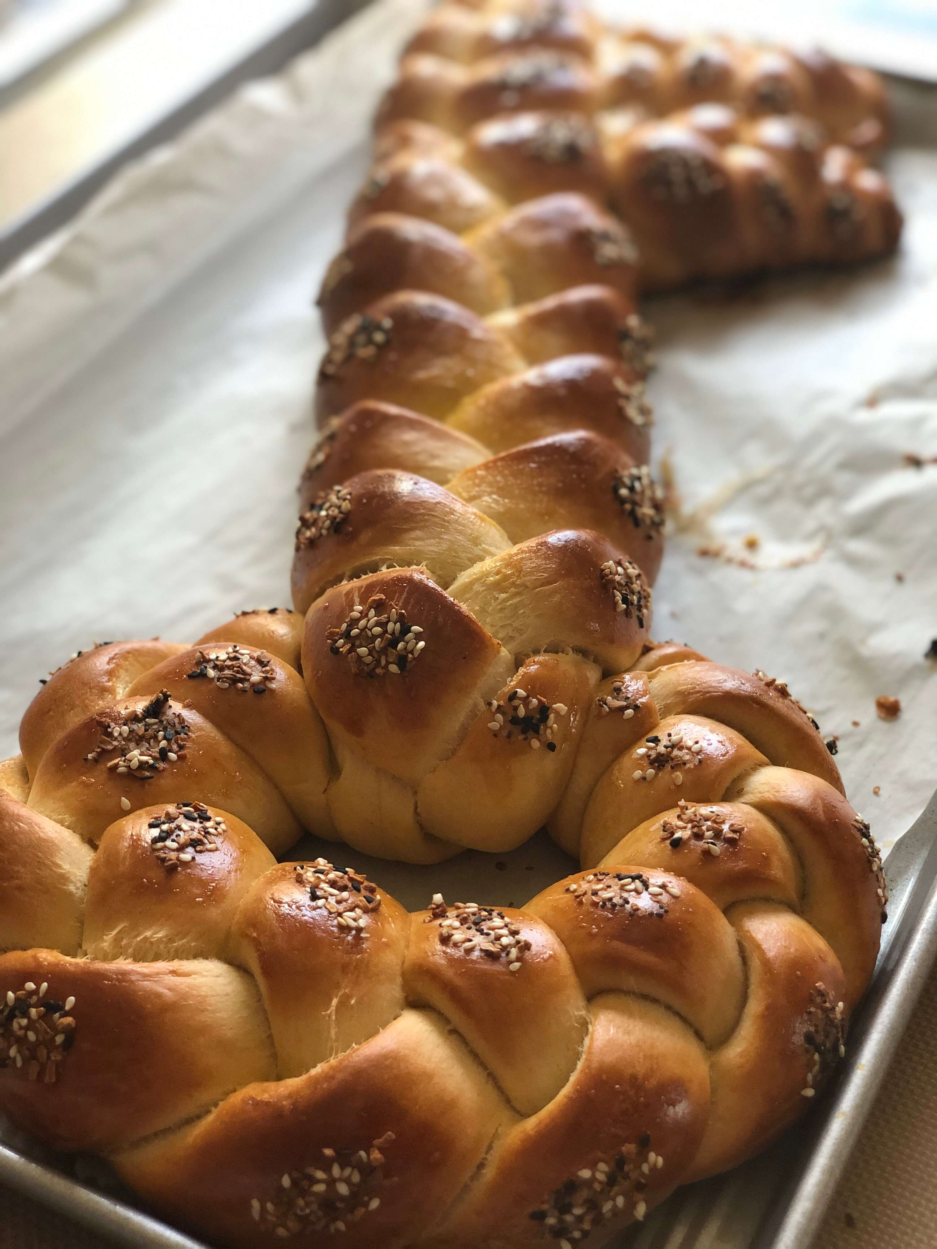 1. Brush the shaped challah with egg wash a total of 3 times (2 eggs and 2 yolks, beaten) for a darker crust: right after braiding, halfway through rising, and right before baking.