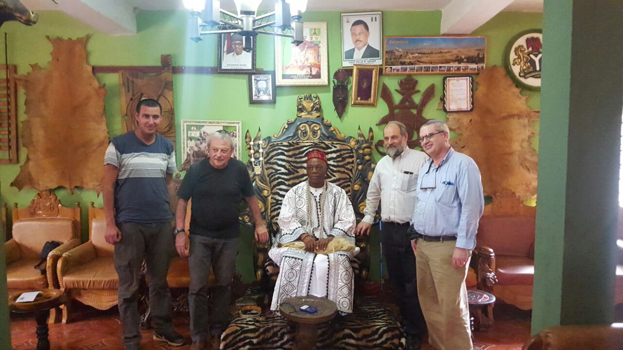 His majesty entered wearing flowing robes, a Magen David, and a cloth crown on his head. He talked about how he perceived our kinship, and about the State of Israel. On a previous visit, when Dani noticed a lion and Magen David on the Igbo king’s clothing, he inquired about them. After all, their tradition is that they are descended from the tribe of Gad, and Gad is not known to have a lion as its symbol. The king answered that there is a Biblical account in which his ancestors, the tribe of Gad, who inherited the land on the east bank of the Jordan, at one point crossed over to the west bank for protection that was offered by the tribe of Yehudah — and hence the king wears the symbol of Yehudah. (That may be a stretched interpretation of Divrei Hayamim, chapter 15.)